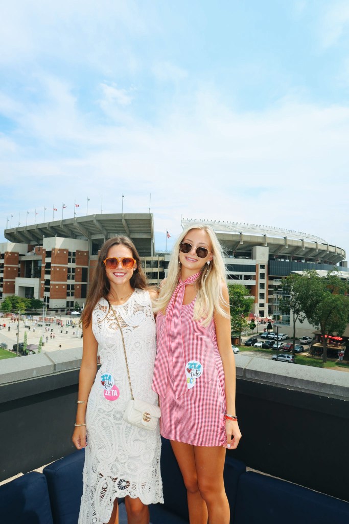 This picture is from one of the first game days of the 2025 season. I chose a simple dress and then accessorized with a matching scarf, statement jewelry, and game day pins to make for the perfect outfit.